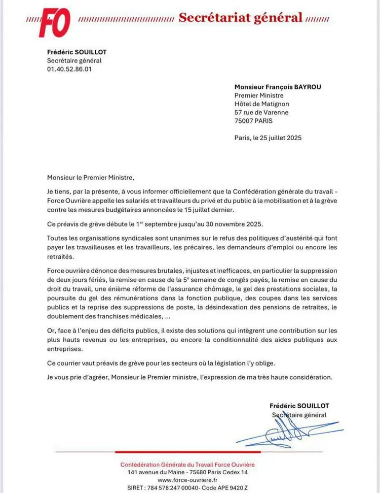 Courrier du Sécrétaire Général F.Souillot au 1er Ministre F.Bayrou